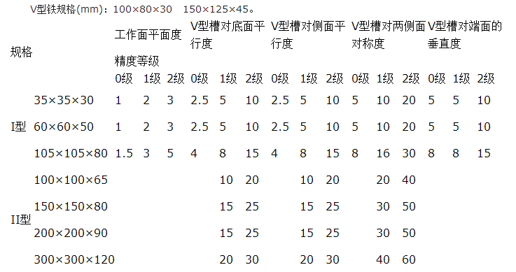 V型鐵按國家GB4972-85標準制造,一般都成對供應,是一個四棱體,四個工作面上或四個尺寸不同的90度的槽。主要適用于軸類零件的檢驗和劃線。